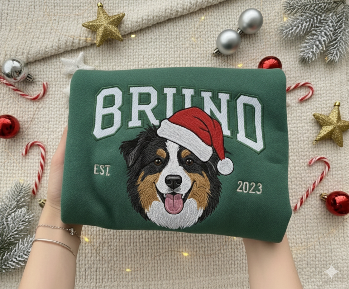 Napisz pierwszą opinię o „Bluza / Koszulka z HAFTEM zwierzaka ze zdjęcia z dużym imieniem w czapce Mikołaja”